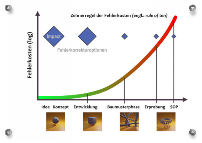In Innovationsprojekten ist es nicht unser vorrangiges Ziel, Leistungs- oder Kostenmerkmale zu verbessern, sondern Risiken und Ausfälle zu reduzieren. Im klassischen Engineering wird dies viel zu häufig nicht beachtet, obwohl seit den 1970er Jahren bekannt ist, dass je länger ein Fehler im Produktentstehungsprozess unentdeckt bleibt, umso höher die Kosten zur Behebung dieses Fehlers werden.